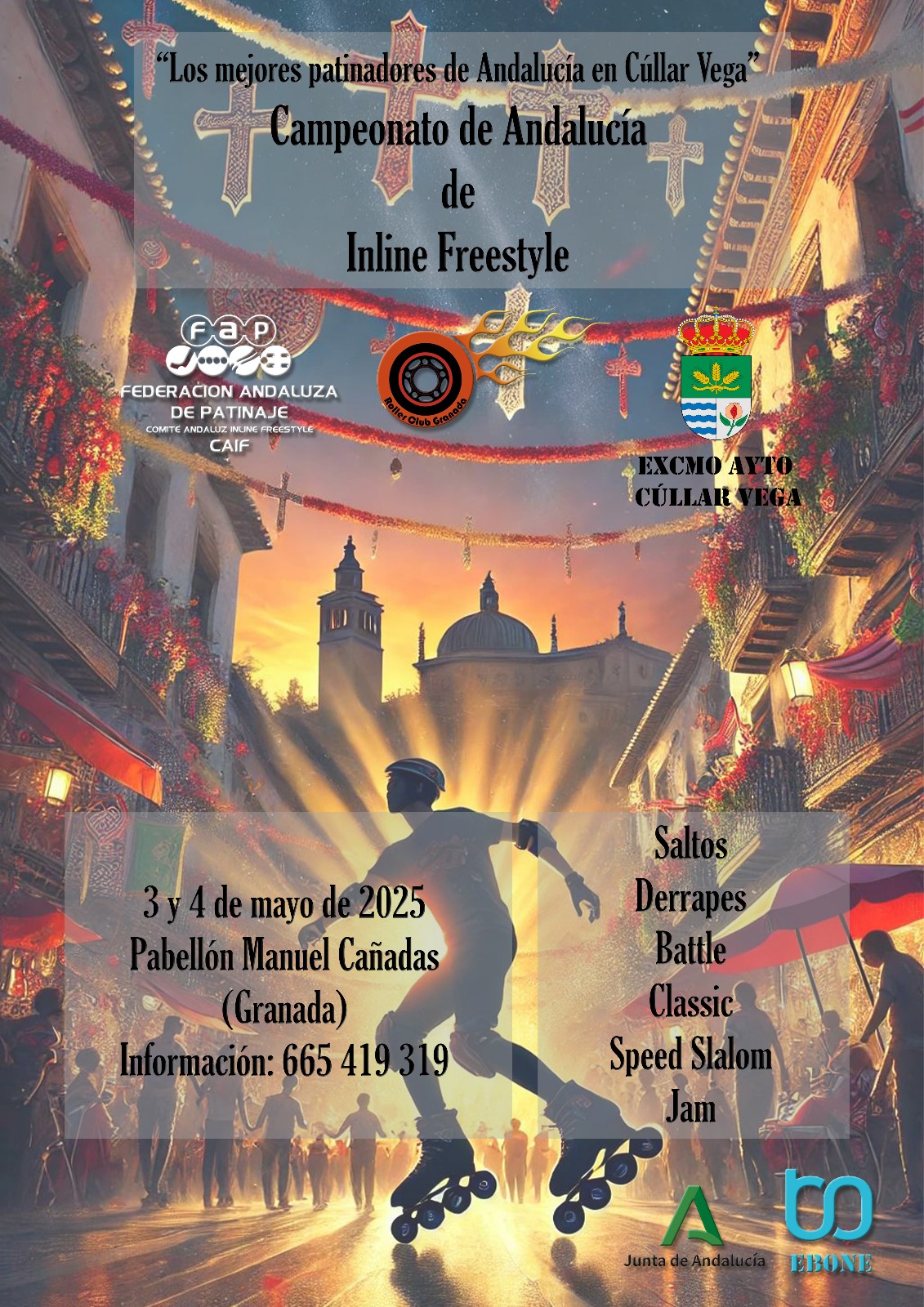 Los días 3 y 4 de mayo tendrá lugar en Cúllar Vega (Granada), el campeonato andaluz de patinaje inline freestyle 2025. Supondrá el cierre de la presente temporada, además de ser prueba que da acceso al campeonato de España. Las inscripciones ya están abiertas para ser gestionadas por los clubes de esta federación.