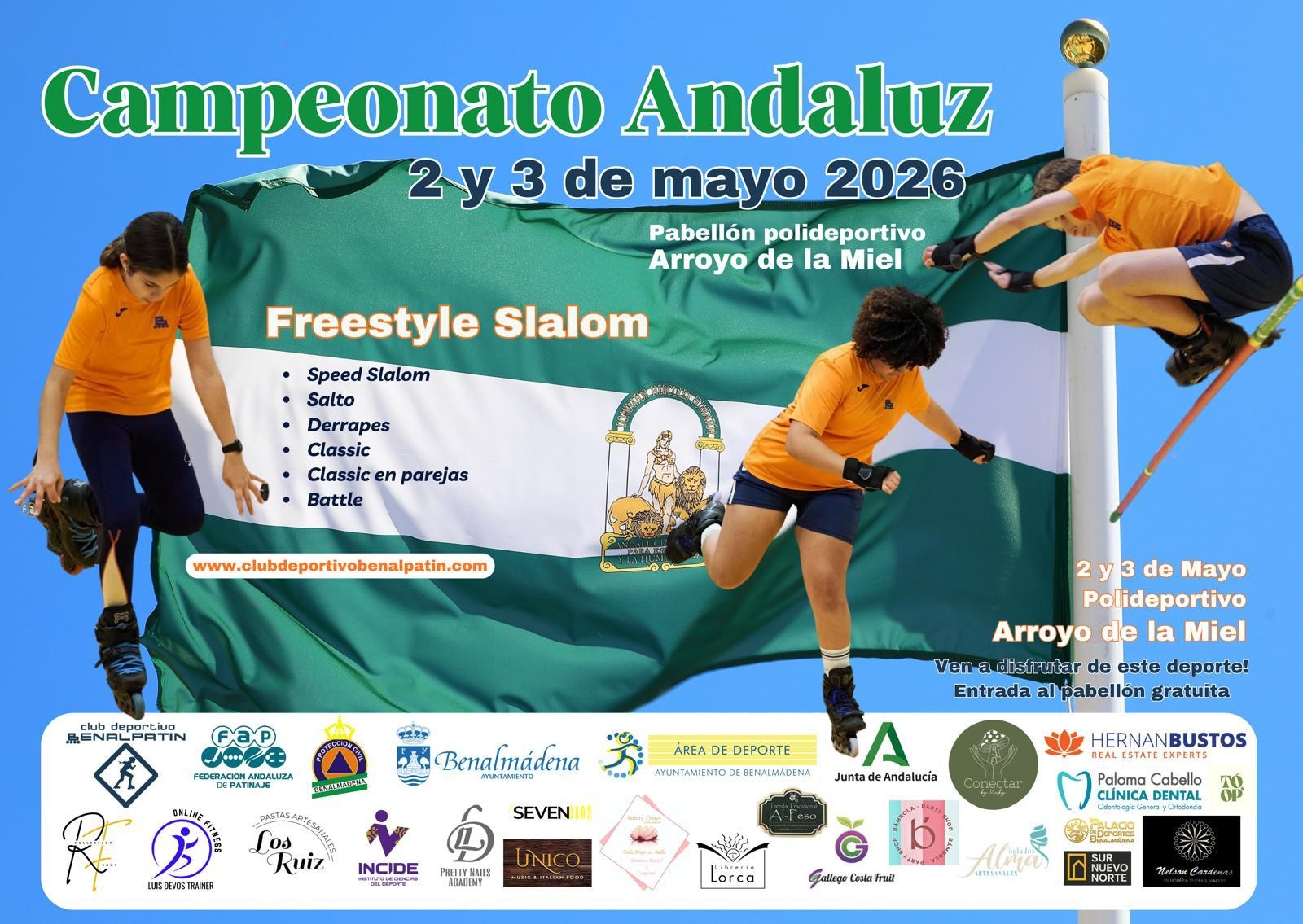 El Club Deportivo Benalpatín tiene el honor de organizar, junto con el Comité Andaluz deInline Freestyle (CAIF), el Campeonato Andaluz de Inline Freestyle 2026. Estacompetición tendrá lugar los días 2 y 3 de mayo en el Polideportivo de Arroyo de la Miel(calle Orujo, 2), y contará con la presencia de los mejores patinadores de Andalucía …